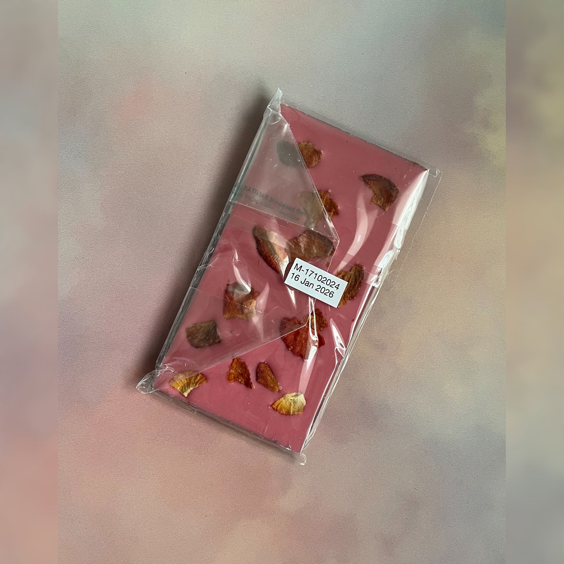 Strawberry Bar: Cocoa butter, cocoa mass, sugar, whole milk powder, lecithin; soy, natural vanilla flavouring, freeze dried strawberries