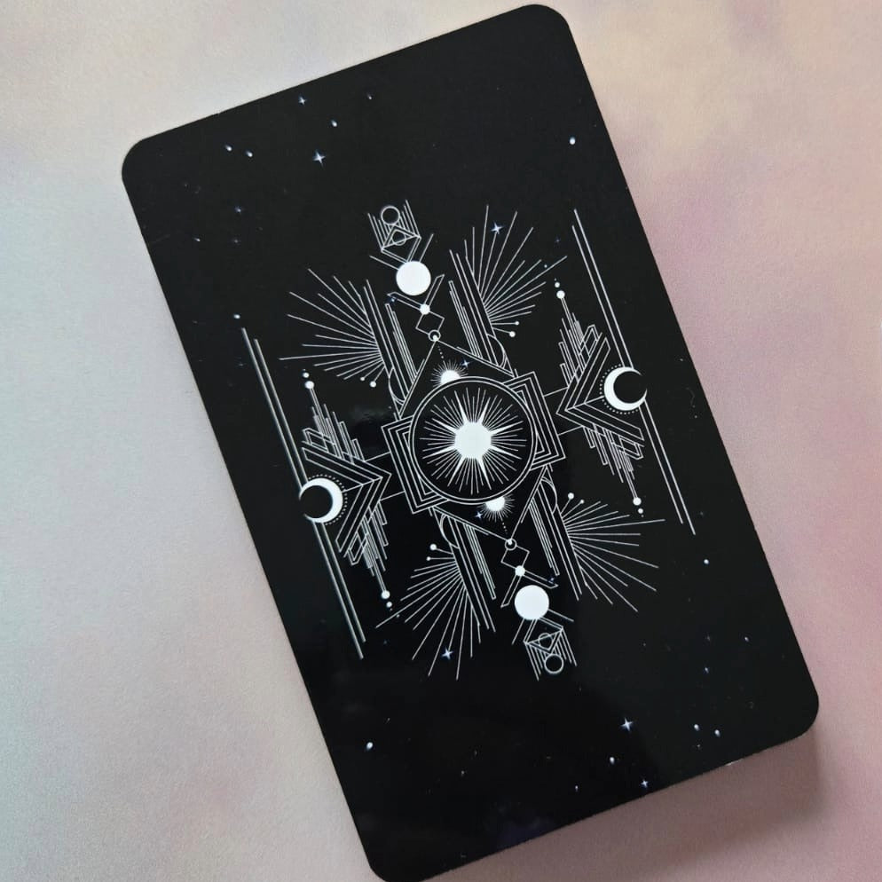 - 78-card oracle deck featuring a black and white art deco-inspired design with silver edges for a touch of magic (final version).